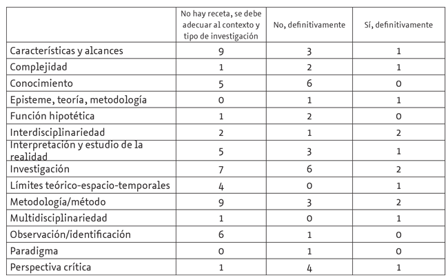 Las percepciones de los investigadores son muy variadas, demostrando así la diversidad de impresiones teórico-metodológicas. Es importante mencionar que cuando se refieren a una determinada impresión, ésta va acompañada de otras ideas y pensamientos, implicando que los investigadores relacionen, a lo largo de toda la encuesta, sus respuestas con las categorías principales del estudio. La categoría “investigación” seguida de “características y alcance”, “metodología/método”, “reflexión” y “conocimiento” han sido las más mencionadas; las menos fueron: “episteme y teoría”, “función hipotética” “multidisciplinariedad” y “paradigma”. Desde otra perspectiva, la presencia o ausencia de los códigos en las respuestas del investigador es muy variada también, significando por ejemplo, que la categoría “paradigma” solo fue mencionada por un investigador a lo largo de toda la encuesta, “multidisciplinariedad” es la segunda menos mencionada, solo una ocasión por dos investigadores, lo mismo sucedió con “episteme y teoría”.