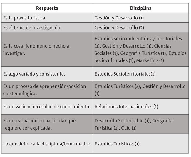Los investigadores perciben que el objeto de estudio se refiere más a la cosa, fenómeno o hecho a investigar (8), seguido por el tema de investigación (2), la situación en particular que requiere ser explicada (3) de la misma manera como un proceso de aprehensión según la posición epistemológica (3), un vacío del conocimiento (1), algo variado y consistente (1), una praxis turística (1) y el tema madre que define a la disciplina que lo estudia (1).