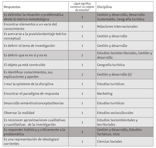 El significado de construir un objeto de estudio es relevante para conocer las implicaciones que se tienen cuando se hace investigación en turismo, además de diagnosticar las referencias para poder establecer un método que articule ésta significación. Así, la mayoría de los investigadores siguen considerando al objeto de estudio como la cosa o fenómeno a investigar (tabla 2).
