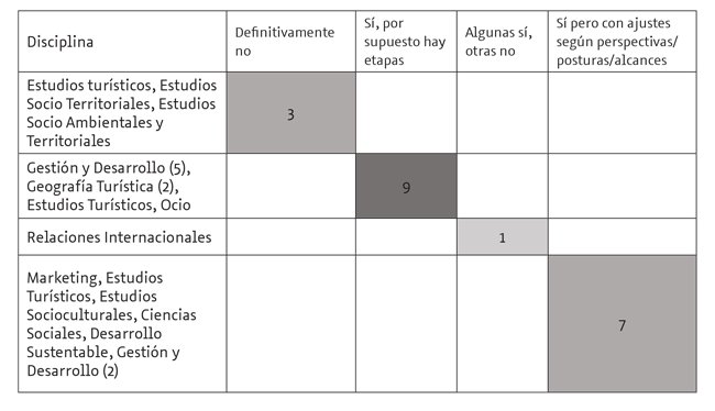 El proceso de construcción de los objetos de estudio en términos de investigación turística también va acompañado de apreciaciones distintas; sin embargo, se pueden resumir en cuatro: aquellos que piensan que definitivamente no hay etapas, aquellos que consideran que efectivamente sí las hay incluso proporcionándolas, están los que consideran que algunas investigaciones las necesitan y otras no; y por último los que opinan que sí las hay pero que es necesario hacer ajustes de acuerdo al tipo de investigación. Ver tabla 3.