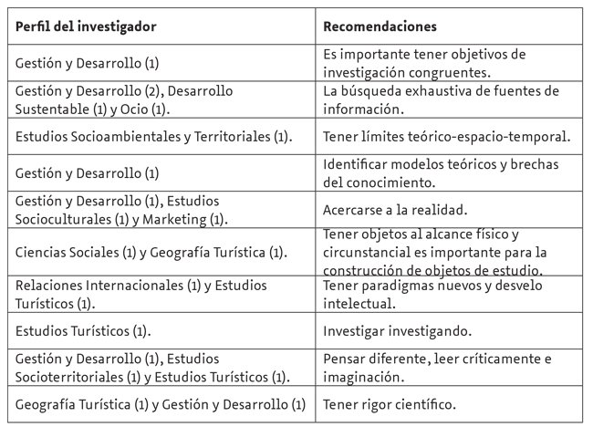 En cuanto a la pregunta cinco del cuadro 1: ¿Cuáles serían sus recomendaciones en el proceso de construcción de objetos de estudio, para los alumnos de posgrado orientados a la investigación en turismo? Lo anterior, puede observarse por disciplina en la tabla 5.