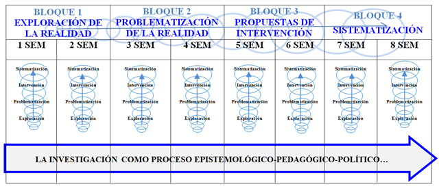 Cada etapa abarca, aproximadamente dos semestres de trabajo, y en este punto, específicamente, explicaré la etapa de Exploración de la realidad (primeros dos semestres) cuyo propósito es que el estudiante se acerque al Modelo Educativo Integral y Flexible (meif), y se integre al proceso de investigación vinculada, de tal modo que esto lo lleve a avizorar de manera distinta a su comunidad, a redescubrirla y entenderla como un espacio de múltiples aprendizajes.