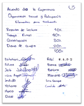 La coevaluación como ejercicio que recupera la experiencia de los estudiantes, parte de un ejercicio en el cual el estudiante se autoevalúa en torno a su participación en clase, entrega de tareas (lecturas comentadas), elaboración y entrega de diarios de campo, asistencia, participación en los procesos de gestión del trabajo comunitario, así como participación en comunidades de aprendizaje e incorporación de saberes. Entre los resultados del instrumento aplicado a los estudiantes, fue posible observar que existe un sentimiento de autoreconocimiento a las condiciones de disposición al aprendizaje y que se fue formando en el periodo semestral, y que es necesario seguir trabajando, Johana Nicolás dice: "en ocasiones debo reconocer que a veces no lo hacía (refiriéndose a los reportes de lectura), a veces las ideas no funcionaban bien, pero era seguir intentando para lograr el objetivo" (refiriéndose a las actividades de vinculación comunitaria) (J. Nicolás, comunicación personal, 12 de junio de 2016).
