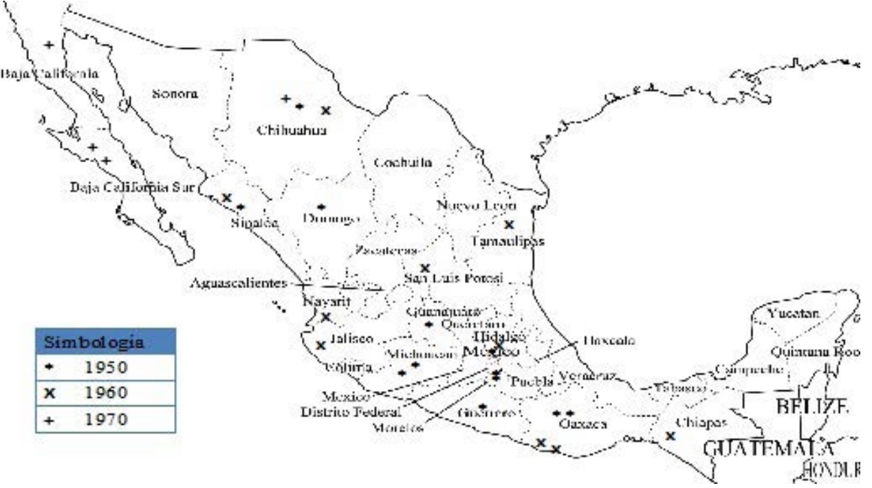 Como resultados favorables para la infraestructura acuícola mexicana se identificó durante el período de 1950 a 1970 el establecimiento de 26 unidades, entre estaciones piscícolas y centros acuícolas, para la producción de crías de peces, moluscos y crustáceos (mapa 1). La gestión de la infraestructura sería de manera interinstitucional a través de diversas entidades que estaban inmersas en diversas secretarías tales como, la de Recursos Hidráulicos, la de Educación Pública, la de Industria y Comercio y la Secretaria de Marina. De igual manera, participaron instituciones financieras como el Banco Nacional de Crédito Ejidal y el Banco Nacional de Crédito Agrícola; y comisiones, como la Comisión Federal y la Comisión Nacional Constitutiva de Pesca (fao, 1974 y Yáñez, 2006).