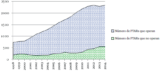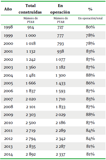 Sin embargo, hay problemas vinculados con la operación de dichas plantas. En este sentido se observa que, de las plantas construidas, alrededor de una quinta parte no están operando. En 1998 el número de plantas activas era 727, lo que significa que sólo 80% operaban. En 2014, la situación es similar: sólo operaban 2 337 plantas, es decir, 81%, mientras que el resto estaban inactivas. Este dato nos habla de que, a pesar del gran esfuerzo hecho para construir las plantas, los organismos de agua y los gobiernos municipales tienen problemas para ponerlas en operación.