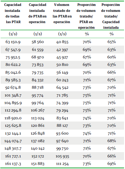 Como es de esperarse, la cantidad de agua residual que efectivamente es tratada es inferior a la capacidad instalada de las ptar existentes y de las plantas en operación. Esto significa que sólo se está tratando alrededor de 71% de la capacidad instalada de las plantas en operación.