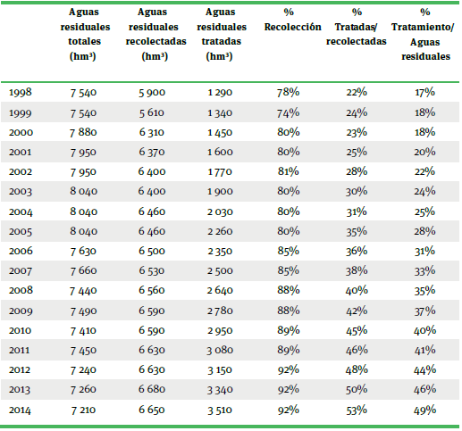 Pasando a la siguiente etapa, se evidencia que la recolección de aguas residuales ha avanzado de 22% en 1998 a 53% en 2014, es decir, el salto ha sido de 31 puntos porcentuales, casi dos puntos por año. No obstante, a pesar del avance constante en este rubro no se han cumplido las metas previstas por los planes y programas que proponían alcanzar el saneamiento total o de 100% para 2001. Por lo que, aun cuando ha habido avances las metas no se han cumplido.