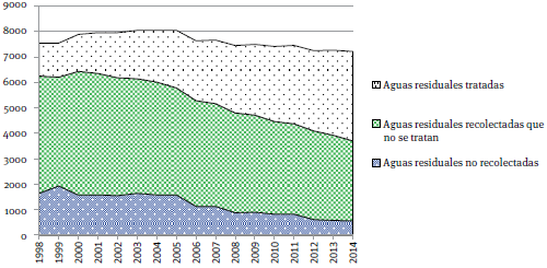 Si el seguimiento de la forma en que se ha cumplido el tratamiento lo hacemos sobre el total de aguas residuales (colectadas y no recolectadas), la proporción de aguas tratadas es todavía un poco menor, ya que se ha avanzado de 17% en 1998 a 49% en 2014. En este caso el avance es de 32 puntos porcentuales. Esto da cuenta de que en la etapa intermedia del servicio de alcantarillado y recolección de aguas residuales el avance no se ha dado en la misma proporción que en el tratamiento. En este caso, en 1998 el porcentaje de aguas tratadas era de 78% y en 2014 se avanzó a 92%, es decir, 14%.
