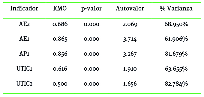 La tabla 2 muestra el resumen del análisis hecho a los cinco indicadores AE1, AE2, AP1, UTIC1 y UTIC2 construidos utilizando las variables que se muestran en la tabla 1 (Parte i y Parte ii) y aplicando la técnica de análisis de componentes principales. El criterio para la selección de los componentes fue seleccionar a todos aquellos con un valor propio mayor que uno (Hair, et al., 2010).
