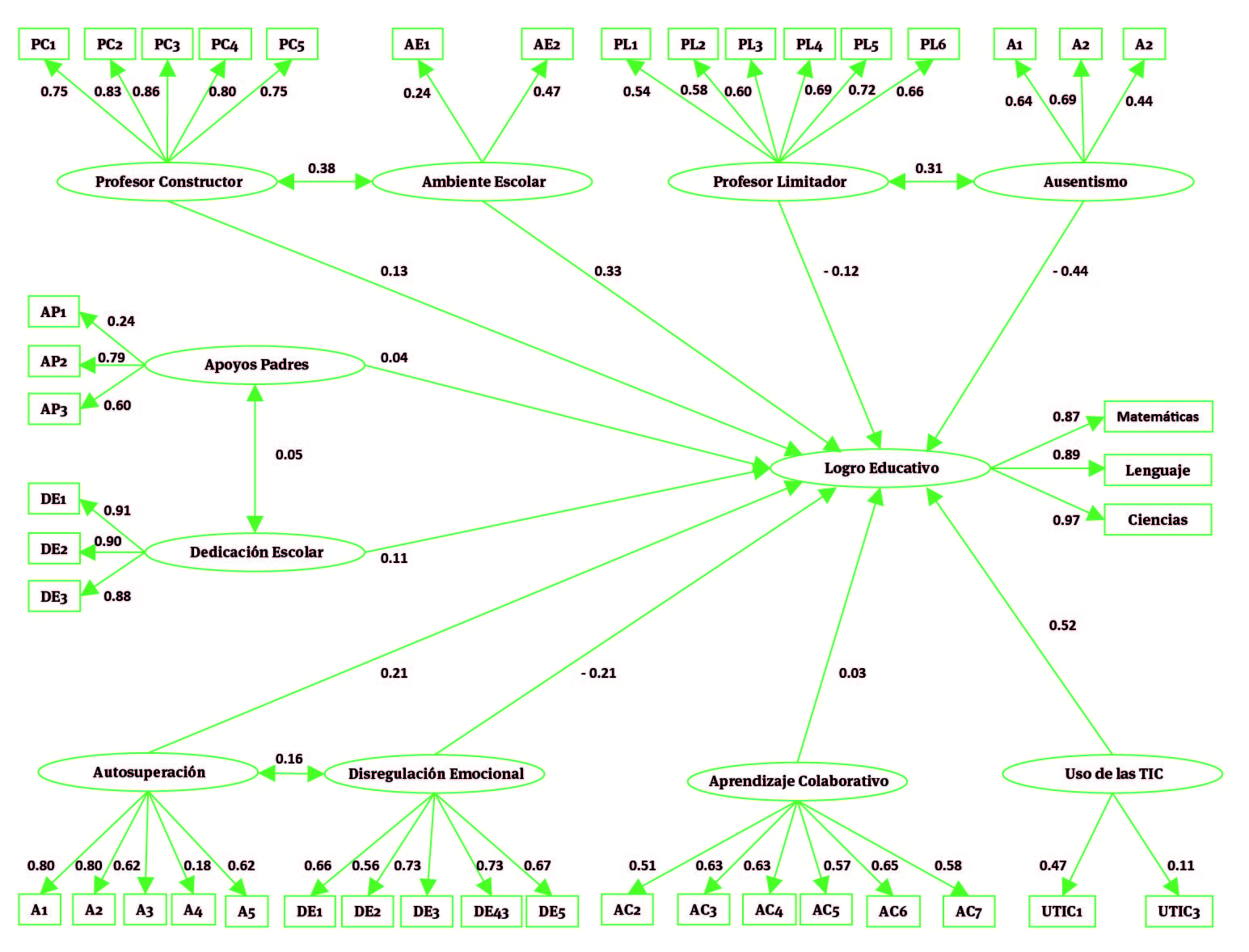 Los resultados muestran, además, ciertas relaciones entre los diferentes componentes. Esto es, el profesor constructor y el ambiente escolar tuvieron un valor estandarizado de 0.38. Referente al ausentismo y profesor limitador o dominante, el peso fue de 0.31. Por su parte, la autosuperación y la disregulación emocional mostraron un valor de 0.16 y, al final, el apoyo padre y dedicación escolar, con 0.05.