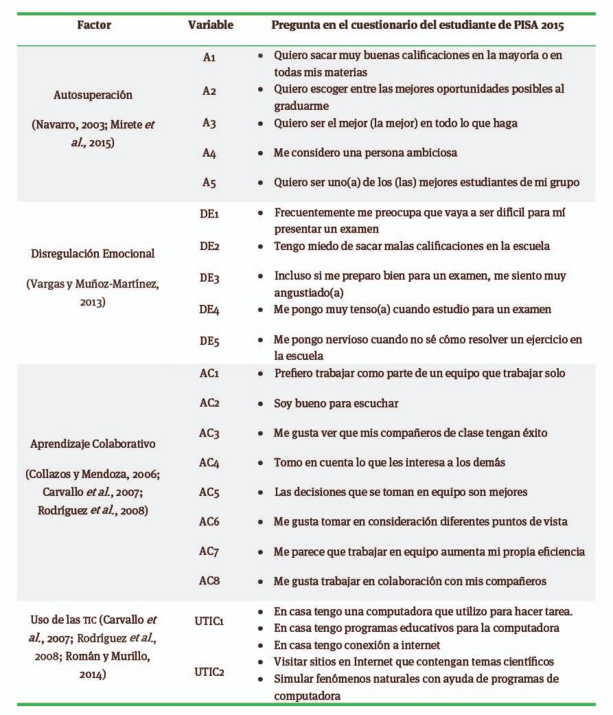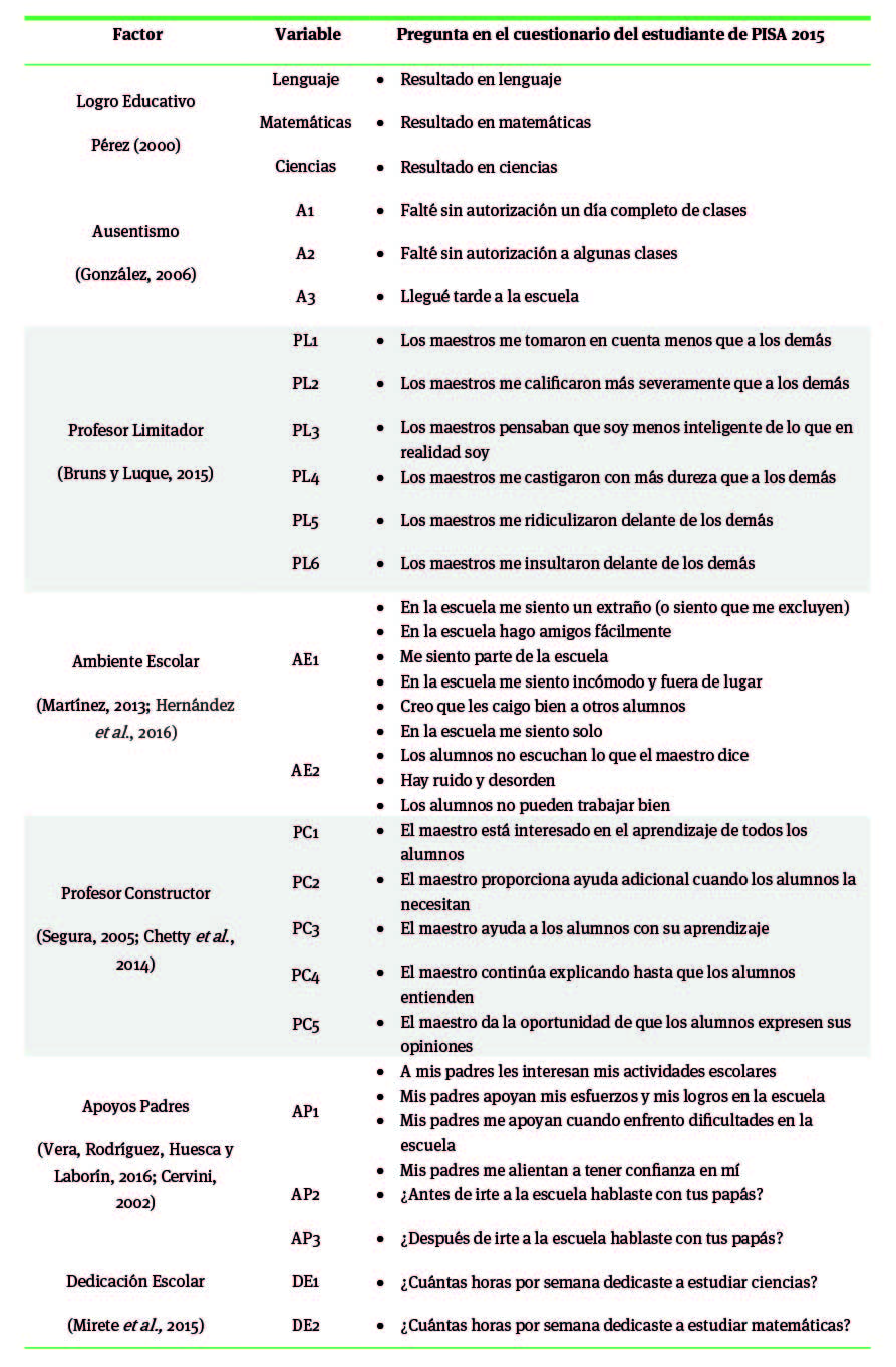 Después de hacer una revisión exhaustiva de la literatura, y considerando los enfoques humanista y sistémico, se propusieron las variables e indicadores que miden a cada uno de los factores. El Modelo Teórico fue construido con un total de once variables o factores latentes y, a su vez, cada factor estuvo conformado por al menos dos variables medibles y/o indicadores. La tabla 1 (Parte i y Parte ii) muestra los factores y sus respectivas variables, así como la pregunta en el cuestionario de pisa 2015.