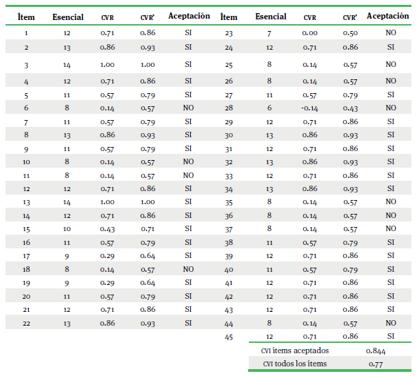 Además, se calculó el índice de Validez de Contenido (cvi, por sus siglas en inglés) como el promedio de los cvr’ de todos los ítems del cuestionario, incluyendo aceptables y no aceptables. Se consideró como aceptable el conjunto de ítems cuando el cvi fue superior o igual 0.58, en este caso se obtuvo un cvi de 0.77.