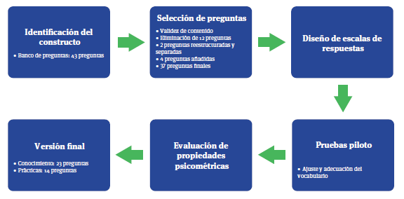 En cuanto al formato de respuesta, se adoptó un modelo de respuesta tipo Likert, con 5 y 3 opciones, para la sección de Prácticas: siempre, frecuentemente, ocasionalmente, pocas veces y nunca. Para la sección de Conocimientos: de acuerdo, ni de acuerdo ni en desacuerdo y en desacuerdo.
