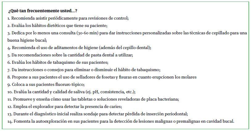 Estas recomendaciones no solo son dadas por normas nacionales sino por organismos y asociaciones internacionales, como la Organización Mundial de la Salud (oms), que reconocen la importancia y urgencia del mejoramiento de la práctica de la odontología preventiva. La actividad preventiva en odontología ha estado presente desde hace más de 80 años, sin embargo, estas acciones han sido limitadas, infrautilizadas e insuficientes, debido, entre otras cuestiones, a barreras relacionadas con los profesionales de la salud bucal, en quienes una amplia gama de obstáculos ha limitado la adopción de la prevención dentro del área, principalmente por la falta de conocimiento y habilidades, así como dudas sobre la efectividad de la prevención o falta de tiempo, entre otras cuestiones (Dyer y Robinson, 2006; Watt et al., 2004; Arheiam y Bernabé, 2015). Además, se ha señalado en tratamientos específicos que las actitudes del odontólogo juegan un papel importante para la aplicación o no de estos (Schwendicke et al., 2013). Aunque realmente, tal y como afirman Kloppe et al. (2005), se sabe poco sobre las actitudes y prácticas que ante la prevención y promoción de la salud tienen los profesionales de atención primaria y, aún más, dentro del área de la odontología. Es por ello, que resulta necesario estudiar los conocimientos que poseen y las prácticas relacionadas con la prevención que son llevadas a cabo habitualmente por los profesionales en odontología, tomando en consideración un instrumento adecuado para dicho propósito, sin embargo, hasta el momento no se cuenta con un cuestionario que evalúe estos aspectos.