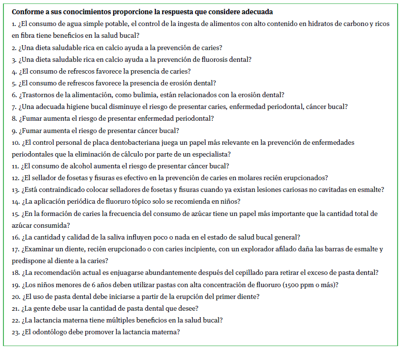 La creación de este instrumento es un paso básico para poder obtener información confiable sobre estos aspectos y, posteriormente, en caso de requerirse, proponer estrategias que favorezcan la obtención de conocimientos adecuados con el objetivo de mejorar la práctica de la odontología preventiva.