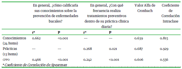 La estimación de la validez de convergencia se calculó a través del Coeficiente de Rho de Spearman, correlacionando las preguntas globales y el puntaje total del cuestionario y de cada sección. Las dos preguntas globales incluidas fueron: “En general, ¿Cómo calificaría sus conocimientos sobre la prevención de enfermedades bucales?”, “En general, ¿Con qué frecuencia realiza tratamientos preventivos dentro de su práctica clínica diaria?”. En esta misma fase, se reaplicó el cuestionario a una submuestra (n=15), dos semanas después de la primera aplicación, para evaluar la estabilidad temporal del instrumento mediante la prueba-reprueba calculando el Coeficiente de Correlación de Intraclase (cci).