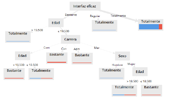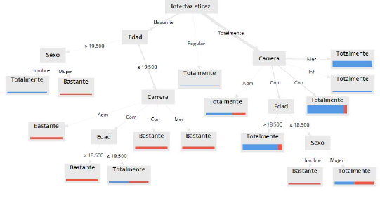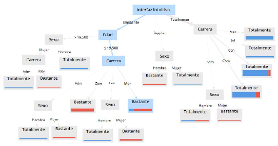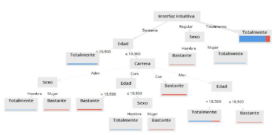 La figura 13 muestra el Modelo Predictivo 2. Por ejemplo, si el alumno considera que la interfaz de la awspc es totalmente intuitiva entonces esta aplicación web facilita totalmente el proceso educativo sobre la probabilidad condicional