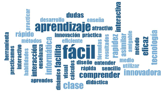 La herramienta MAXQDA permite realizar el análisis cualitativo por medio de la construcción de la nube de palabras, esto es, Fácil, Aprendizaje, Clase y Comprender son las palabras más frecuentes localizadas en las preguntas abiertas.