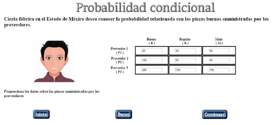 El modelo tpack permitió la planeación de la aplicación awspc por medio del conocimiento tecnológico (Lenguaje de programación php y html), conocimiento pedagógico (simulación por computadora) y conocimiento disciplinar (probabilidad condicional y de intersección). La figura 6 muestra la solicitud de la información sobre el suministro de piezas para iniciar la simulación en la aplicación awspc .