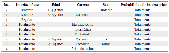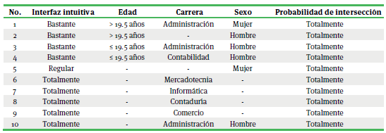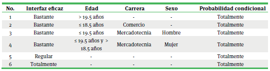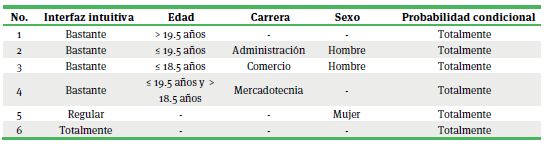 La figura 17 muestra el Modelo Predictivo 4. Por ejemplo, si el estudiante considera que la interfaz de la awspc es totalmente intuitiva y estudia Comercio entonces esta aplicación web facilita totalmente el proceso educativo sobre la probabilidad de intersección.