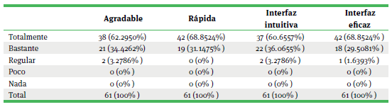 De acuerdo con los estudiantes, la aplicación awspc es una herramienta totalmente agradable (n=38, 62.2950%) y rápida (n=42, 68.8524%). Incluso, la tabla 11 muestra que la interfaz web es totalmente intuitiva (n=37, 60.6557%) y eficaz (n=42, 68.8524%).