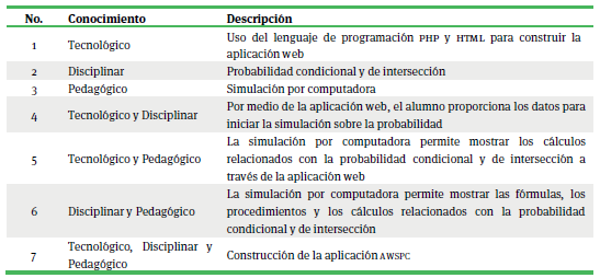Cabe mencionar que el conocimiento pedagógico se refiere a la identificación de las actividades relacionadas con la enseñanza que permitan mejorar el aprendizaje (Chang et al., 2015; Samperio y Barragán, 2018). En particular, la estrategia sobre la simulación permitió el desarrollo de las competencias por medio de la presentación del procedimiento sobre el cálculo de la probabilidad condicional y de intersección.