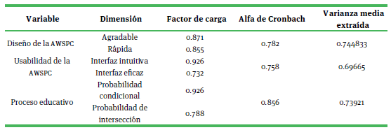 El instrumento de medición contiene las variables de Diseño de la awspc, Usabilidad de la awspc y Proceso educativo. La escala de medición está compuesta por las categorías: Totalmente (1), Bastante (2), Regular (3), Poco (4) y Nada (5). Asimismo, este estudio calcula los datos sobre la fiabilidad (Alfa de Cronbach) y validez (Varianza media extraída) por medio del programa spss (Ver tabla 3).