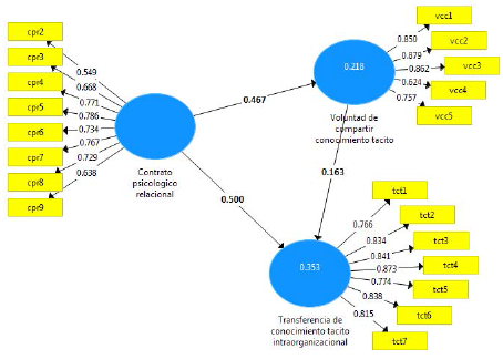 En cuanto a la predicción del modelo estructural, el coeficiente de determinación (R2) obtenido para el constructo voluntad de compartir conocimiento tácito fue de 0.218, es decir que la variable latente contrato psicológico relacional sólo explica el 21.8% de la varianza de este constructo y respecto a la transferencia de conocimiento tácito dentro de la organización, el coeficiente de determinación R2 fue de 0.353, resultando que el contrato psicológico relacional y la voluntad de compartir conocimiento tácito explican el 35.3% de la varianza de este constructo, tal como se muestra en la figura 2 correspondiente al modelo estructural en donde se exhiben también los valores de las cargas factoriales de cada una de las variables observables y los valores path de las relaciones estructurales.