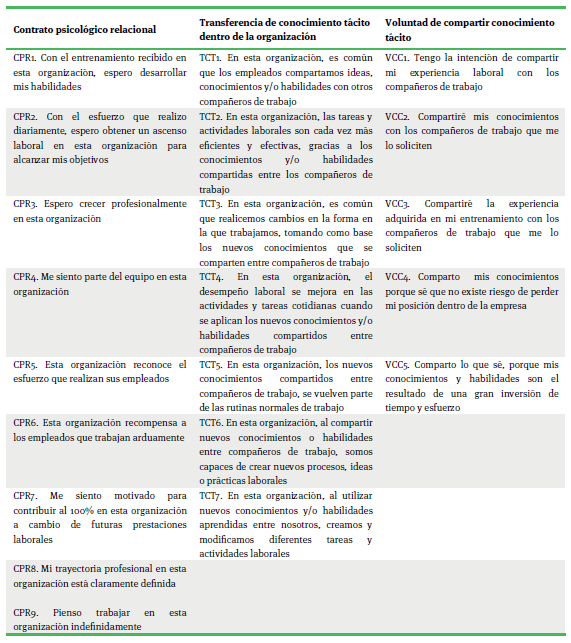 Para la evaluación de los constructos que integran el estudio, y desarrollar el cuestionario utilizado, se realizó el siguiente procedimiento: primeramente se hizo una revisión de la literatura, para conocer las diversas formas en que las variables habían sido evaluadas; enseguida se seleccionó el instrumento y se adaptó al contexto cultural; luego se hizo la traducción (en donde fue necesario); posteriormente se realizó la primera versión y se sometió a consideración de un grupo de expertos para lograr un mejor entendimiento de los ítems y finalmente con base en los comentarios y sugerencias vertidas por los expertos se corrigió el cuestionario y se formuló la versión final. Todos los ítems fueron diseñados con afirmaciones evaluados en escala Likert de cinco puntos que va del 1 “totalmente en desacuerdo” a 5 “totalmente de acuerdo” para que los participantes seleccionaran el grado de acuerdo o desacuerdo que mejor describiera su situación laboral. El cuestionario quedó integrado por 21 ítems, de los cuales 9 ítems fueron adaptados de la Escala del Contrato Psicológico (PCS) desarrollado por Millward y Hopkins (1998) para evaluar el contrato psicológico relacional, 5 ítems fueron adaptados con base en Bock et al., (2005) y Máynez (2011) para evaluar la voluntad de compartir conocimiento tácito y 7 ítems fueron utilizados con base en Máynez (2011), para evaluar la transferencia de conocimiento tácito dentro de la organización, mismos que se muestran en el anexo 1.