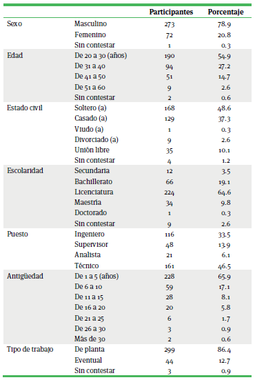 El levantamiento de los datos se llevó acabo en el periodo comprendido de agosto a octubre de 2016, en total se recolectaron 356 cuestionarios, de los cuales se descartaron 10, por no reunir la información solicitada, quedando 346 cuestionarios con 21 ítems válidos para su análisis. La muestra estuvo conformada por 273 hombres (78.9%), 72 mujeres (20.8%) y una persona sin contestar esta pregunta (0.3%). La edad de los participantes estuvo principalmente comprendida entre 20 y 30 años de edad (54.9%), la mayoría de los respondientes eran solteros (48.6%), en general contaban con escolaridad de licenciatura (64.6%), el 46.5% de ellos ocupaban puestos de técnicos, la mayoría contaba con una antigüedad de 1 a 5 años (65.9%), y el 86.4% reportó tener una relación laboral de planta en la empresa, tal como se muestra en la tabla 1.