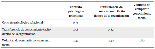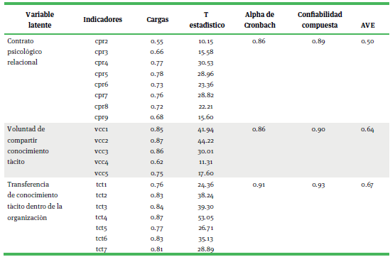 De acuerdo con Chin (1988), para que la confiabilidad del indicador sea aceptable recomienda que preferentemente alcance un valor de 0.70 o superior, pero si existieran indicadores con cargas menores, podrían retenerse siempre y cuando en el constructo existan indicadores con cargas superiores a 0.70. En el presente modelo se cumple con esta condición al obtener cargas superiores a 0.70, en la mayoría de los indicadores a excepción de tres ítems correspondientes al constructo contrato psicológico relacional, (cpr2, cpr3 y cpr9) y un ítem perteneciente al constructo intención de compartir conocimiento tácito (ic4), sin embargo, siguiendo el criterio de Chin (1988) los ítems fueron retenidos al existir otros indicadores en los constructos con cargas superiores a 0.70. En el caso de la confiabilidad de consistencia interna de los constructos, Bagozzi y Yi (1988) recomiendan que esta sea 0.70, o más alta cuando se trata de una investigación exploratoria. Aunque tradicionalmente se utiliza Alpha de Cronbach para evaluar la confiabilidad de consistencia interna en investigaciones relacionadas a las Ciencias Sociales, Bagozzi y Yi (1988) sugieren la evaluación de la confiabilidad compuesta como reemplazo. En el presente modelo se muestra un alto nivel de confiabilidad de consistencia interna al haber obtenido valores superiores a 0.70, tanto en la evaluación del Alpha de Cronbach, como en la confiabilidad compuesta.