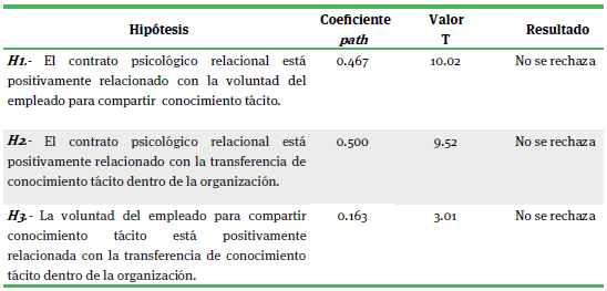 Los resultados del modelo planteado indican que el contrato psicológico relacional contribuye positivamente tanto con la voluntad del empleado para compartir conocimiento tácito, como con la transferencia de conocimiento tácito dentro de la organización, y la voluntad del empleado para compartir este conocimiento también influye positivamente en la transferencia del mismo dentro de la organización.