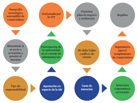 Más aun, las ies y cpi deben considerar, además del marco normativo, el diseño e implementación de políticas para la creación de empresas spin off (pues éstas son el resultado de un sistema que enlaza, cultura de emprendimiento e innovación), las capacidades institucionales y organizacionales para fomentar la tt, y un esfuerzo prolongado para que el emprendimiento universitario genere cada vez más productos de alto impacto económico y social.