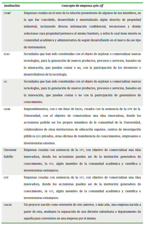 Más adelante se analizan elementos de la normatividad que se abordan en los casos. Ahora bien, un primer tema es la ausencia del concepto de empresas spin off, debido a que la lct no lo establece con claridad; en la tabla 1 se analiza lo que cada institución entiende por este concepto.
