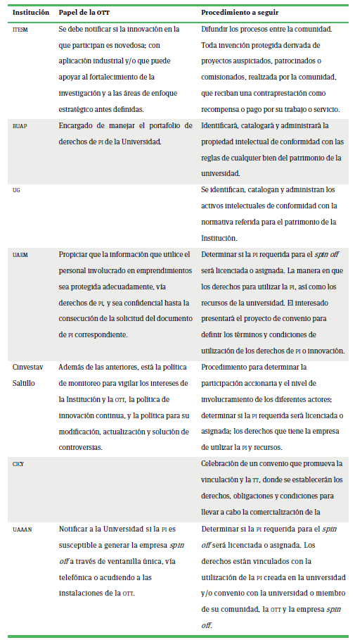 En otras palabras, el principal elemento que la normativa de estas entidades académicas destaca, en términos de la transmisión de los Derechos de Propiedad Intelectual (dpi), es que la ott representa el actor clave que definirá el tipo de protección, los procesos de comercialización y evaluación de los prospectos de empresas spin off. En general, la normativa tiene diversos grados de definición y alcance, sin embargo, es posible sintetizar que se definen los diferentes tipos de actores y su participación, se especifica el uso de los recursos de la institución, el formato de asignación de los dpi y la titularidad de los dpi que del emprendimiento se deriven.