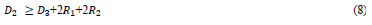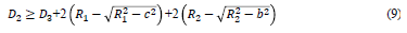The third column of table 2 contains the values of the right side of equation (8) obtained when the parameter values of table 1 are used with the current model of oiml (2004). The geometrical constraint for the current model, equation (8), is not satisfied for any of its left and right side values (second and third columns in table 2). On the other side, the same parameter values plus the additional four stated at the beginning of this section yields nine of thirteen rows in table 2 with compliance of equation (9), that is, the right side of equation (9) is lower than D2, which is the left side of both equations (8) and (9).