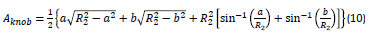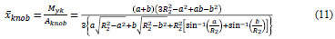 The knob must be divided into two parts. The first one is a straight circular cylinder with a radius equal to [D2/2 – R2], but this time its height equals [ + b] (figure 1, and knob section of figure 4). The second part is a solid of revolution with the center in the symmetry axis of the weight, whose cross-section area is the cut semicircle with a radius equal to R2 shown in the knob section of figure 4. Calculation of that cross-section area is straightforward by integration.