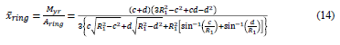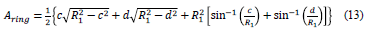 The ring also needs to be divided into two parts, but this time a subtraction approach is used. The first part is a straight circular cylinder with a radius equal to [D3/2 + R1], and its height equals [c + d] (figure 1, and ring section of figure 4). The second part, whose volume must be subtracted from that of the first part, is a solid of revolution with the center in the symmetry axis of the weight whose cross-section area is the cut semicircle with a radius equal to R1 shown in the ring section of figure 4. Calculation approach of that cross-section area (Aring, below) is the same as for equation (10), so