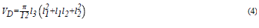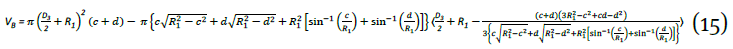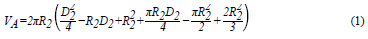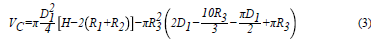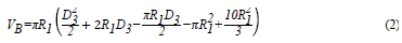 An equation (5) is the algebraic sum of the four volume sections. Equation (4) is elementary, just the formula of a truncated circular cone; hence, it will not be addressed in this work anymore. Now, even though equations (3) to (1) are not difficult to understand, deduction of equation (1), i.e., the volume formula of the knob, is shown as an example of how to proceed, and because the intermediate equations will serve later.