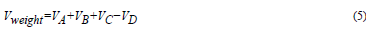 Density Test Method E in oiml (2004) assumes that weight is an assembly of four simple geometric forms. Therefore, the weight volume (Vweight) becomes the algebraic sum of the volumes of the four sections: the knob A, the ring B, the body C, and the recess D (figure 1, without recess).