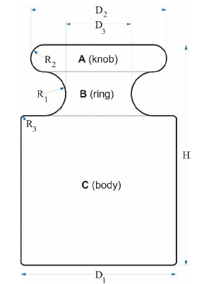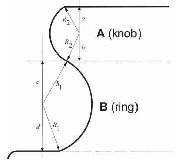 Equation (1), published in oiml (2004), assumes that the knob ends in a semicircle shape, as was considered during the development of equations (6) and (7) that lead to equation (1). The same assumption applies for the volume determination of the ring section, VB: it is necessary to assume that the shape of the edge of the ring is an outward concavity semicircle, to be able to deduce equation (2). However, to support these assumptions, the following relation between diameters and radii in the knob and the ring would have to be met (figure 1):