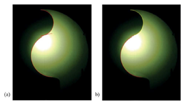 Figure 3 shows a picture of real oiml R 111-1 weights measured with an optical comparator. The edges of both sections, the knob and the ring, are best fitted with circular sectors (b) than with semicircles (a). Figure 3a has two red semicircles: one in the knob from 90° to 270°, and another in the ring from 270° to 450°, clockwise. On the other hand, figure 3b has a yellow circular sector that goes from 90° to 255°, whereas the ring sector (red) in the same figure goes from 270° to 428°, also clockwise. The excess on both contours of figure 3a is notorious.