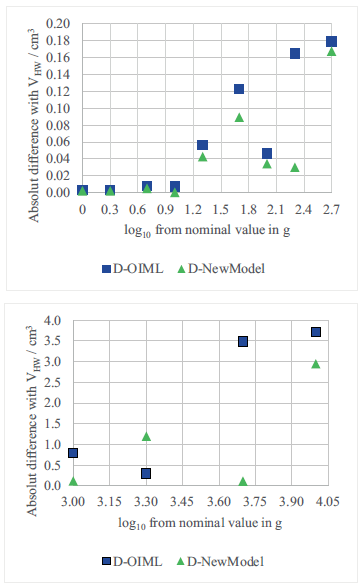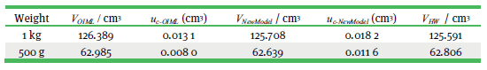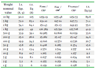 The new model has bigger uncertainties than the current oiml (2004) model, but both of them have the same effect regarding the VHW value shown in table 3, i.e., for one nominal weight the discrepancy between the values of VOIML ± uc-OIML or VNewModel ± uc-NewModelagainst the VHW value are significant (Taylor, 1997). That is, the VHW values are not within the uncertainty of the current model or that of the new model. However, it is important to note that the closest possible value of the volume with the current model is more distant from the hydrostatic weighing volume than the furthest possible value obtained with the new model.