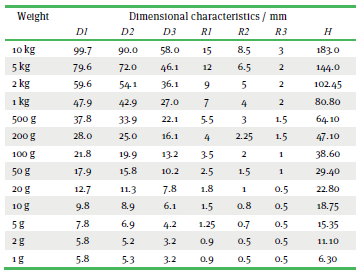 However, the hydrostatic weighing method is not simple to implement and consumes a considerable amount of time when the volumes of a series of weights need to be determined, due mainly to the times of drying and tempering (Kobata et al., 2004; Malengo and Bich, 2012). So, when the immersion of the weight in a liquid is not an option, it is called Method E, that is, the volume determination of the weights by geometric measurement became a good option. Even though risk of scratching the surface is present during the geometric measurement of the weight, the restriction of the method on class E and F weights is advised (Myklebust et al., 1997; oiml, 2004).