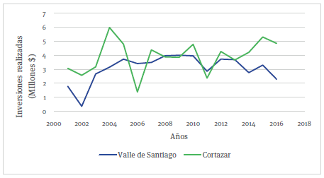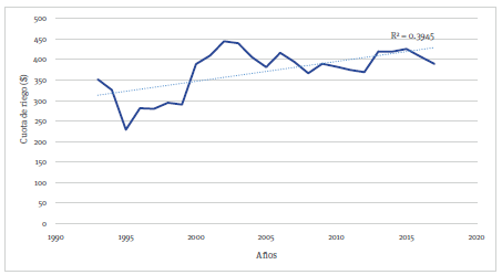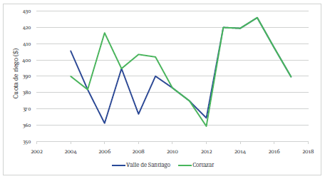 Las cuotas de riego cobradas a los usuarios de los Módulos Valle de Santiago y Cortázar, a precios constantes, muestra una tendencia creciente a partir del año 2012, como se aprecia en la gráfica 1, en la que se observa su evolución durante el período 2004-2017. Esta ha sido muy similar en ambos módulos, salvo en algunos años en que el módulo Valle cobró 10% menos que la tarifa del módulo Cortázar.