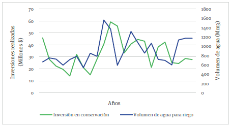 ¿Cómo se explica el comportamiento de ambas variables? Como ya se señaló, la inversión depende principalmente de la recaudación obtenida por los módulos de riego, es decir, que el presupuesto para las obras de mejora y conservación depende de la recaudación de ingresos proveniente de las cuotas del período anterior, y puesto que las cuotas se cobran por superficie regada, la inversión dependerá del volumen disponible para el riego, también durante el período anterior.