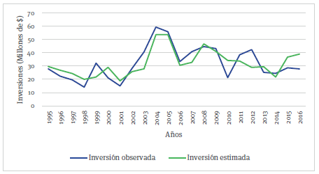 Con base en este modelo, se observa en la gráfica 6 que el valor estimado de la inversión sigue correctamente el comportamiento de los datos a lo largo del tiempo, y que el comportamiento de la inversión se ve reflejado en el modelo estimado.