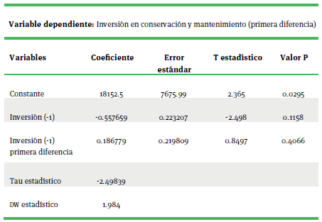 En conclusión, con base en la información disponible para la inversión en infraestructura, para el período 1994-2016, posterior a la transferencia del d.r. 011, la serie de tiempo no es estacionaria, el orden de integración es uno y no muestra una tendencia determinista creciente en el tiempo -lo cual es consistente con los hallazgos señalados en la literatura relevante- no obstante el incremento anteriormente señalado en las cuotas de mantenimiento. Este resultado no se modifica si se realiza la prueba adf sin constante.
