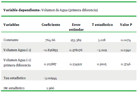Los resultados de la prueba adf permiten rechazar la hipótesis de raíz unitaria debido a que la Tau estimada -3.00944 es mayor en valor absoluto al valor crítico del 5% de la prueba que es -3. Además, el valor probabilístico de la inversión rezagada un período (Inversión (-1)) es inferior al 5% que se consideró como el nivel de significancia. En conclusión, la serie correspondiente al volumen de agua es estacionaria.