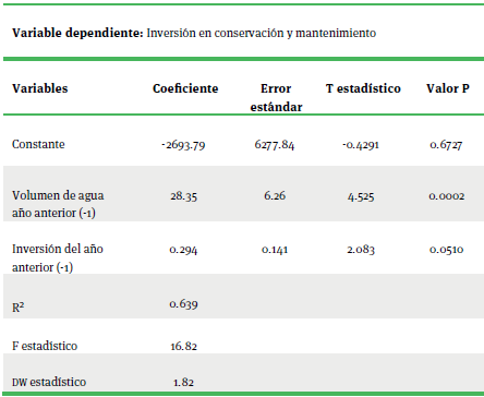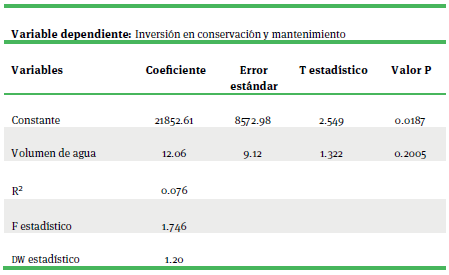 En la sección previa, se señaló que el presupuesto asignado por los usuarios agrícolas para la inversión en el mantenimiento y la conservación de las obras en los módulos, varía en función de los ingresos recaudados, los que a su vez, dependen de la cuota de riego y del volumen de agua disponible para el riego. Por lo que, en un primer modelo estadístico, se supuso que la inversión en mantenimiento y conservación depende positivamente del volumen de agua disponible para riego.
